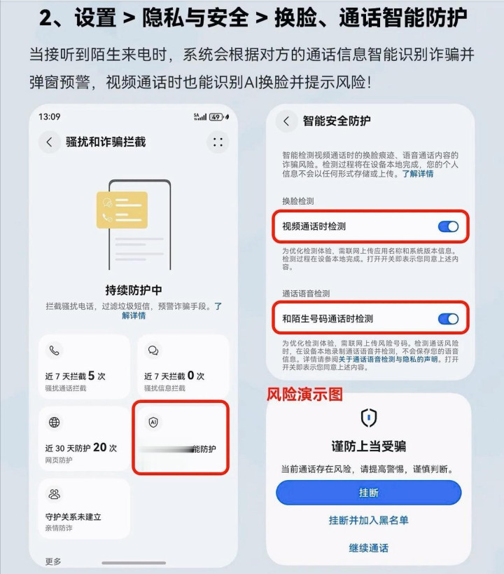 系统层级的风险识别才是真正有效的防线。通话风险检测、视频异常识别,本质上是把算法前置,在你产生判断之前给出提示。
